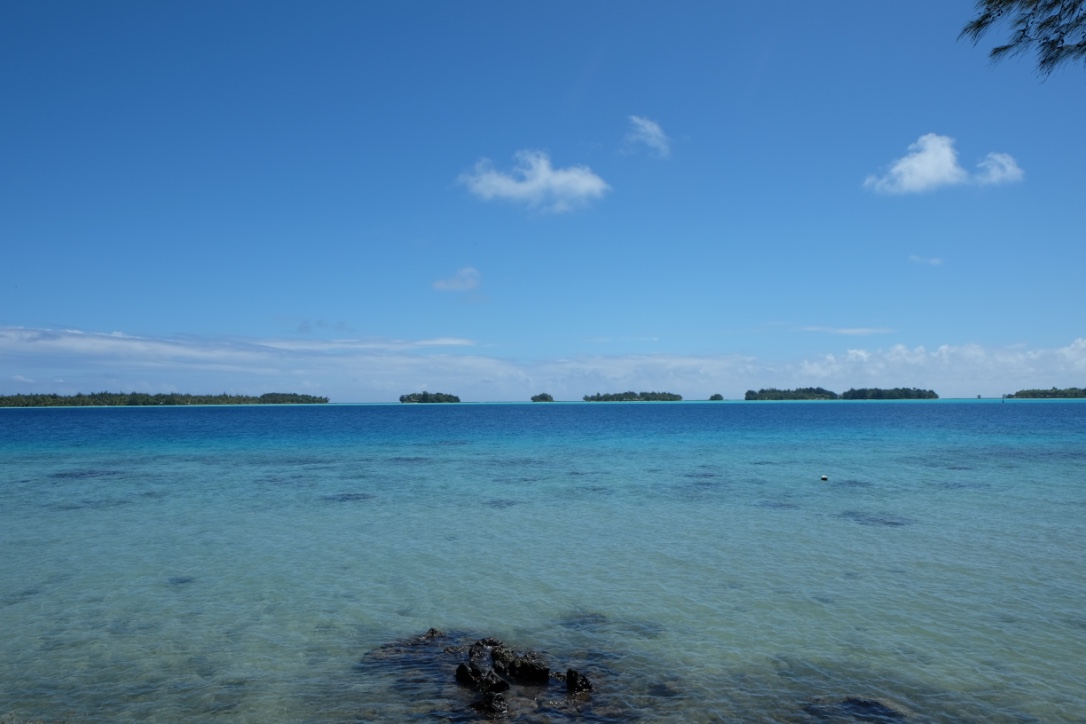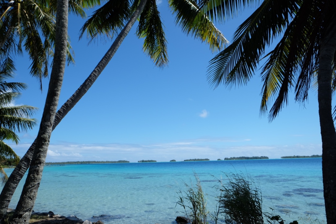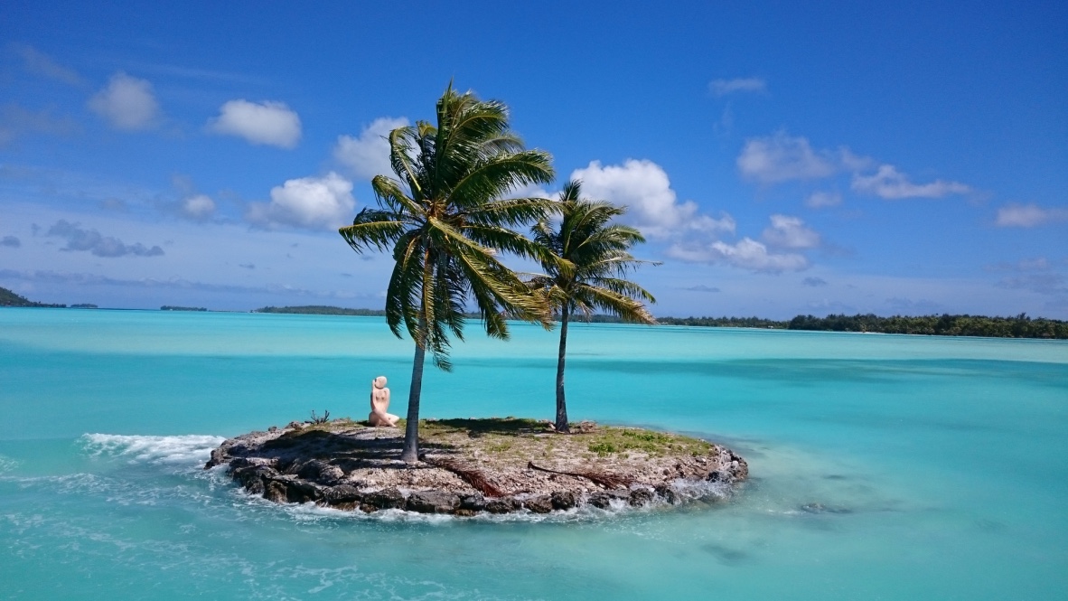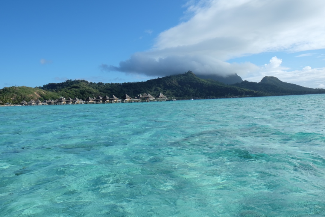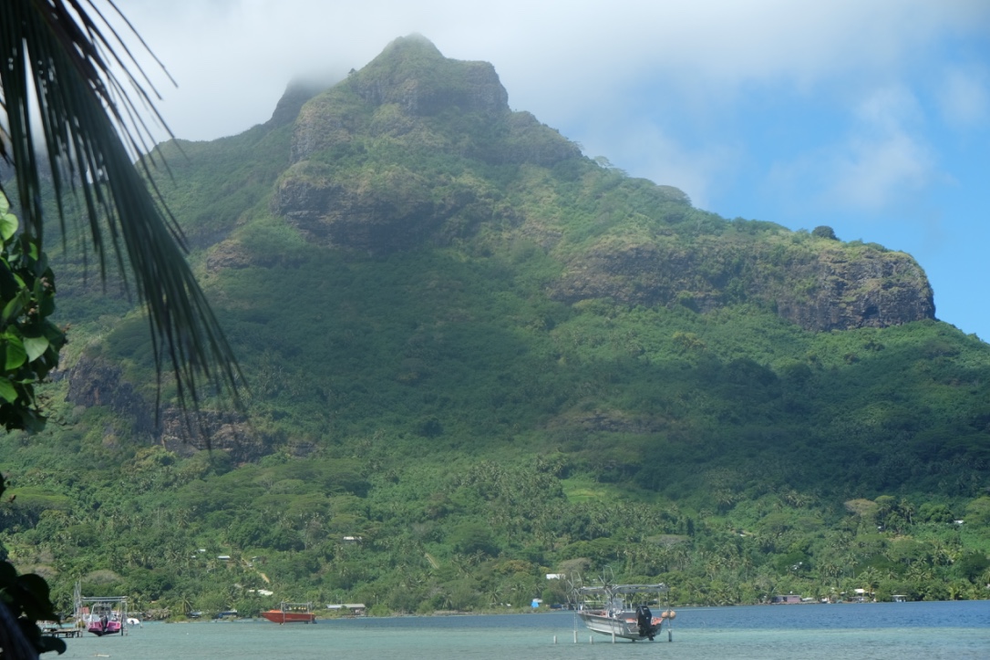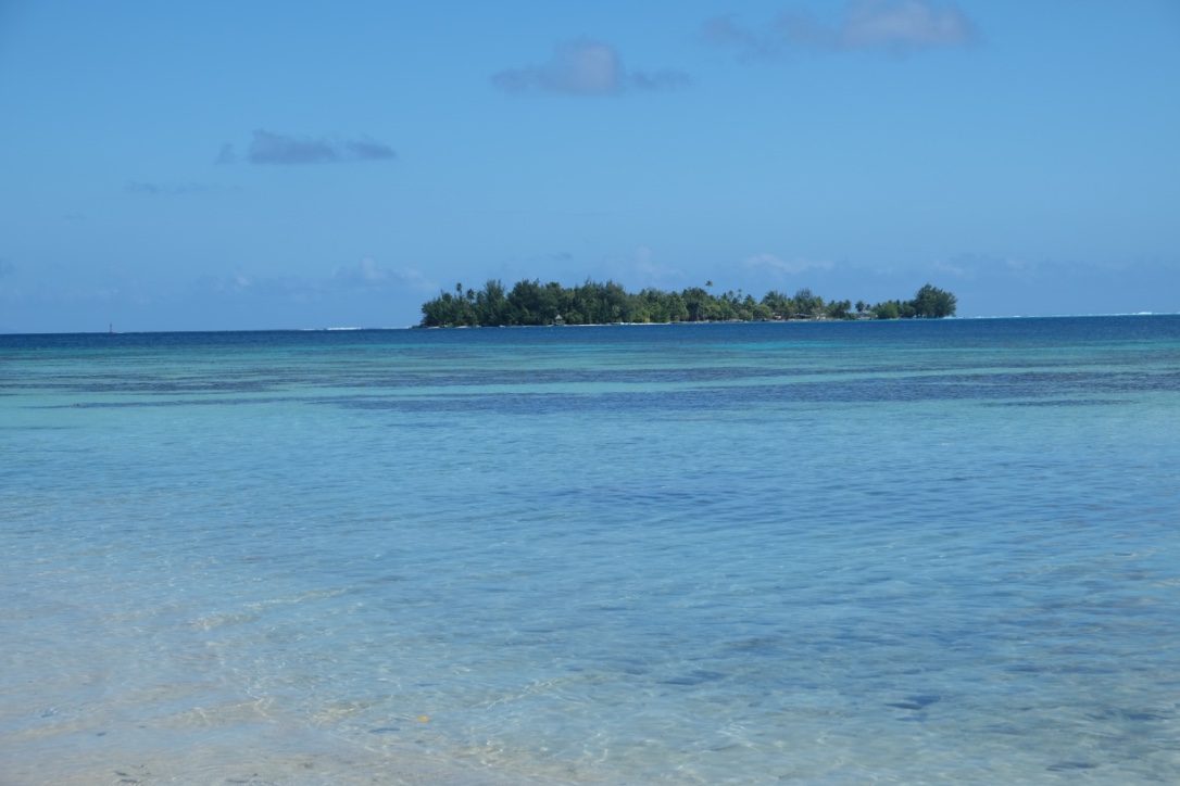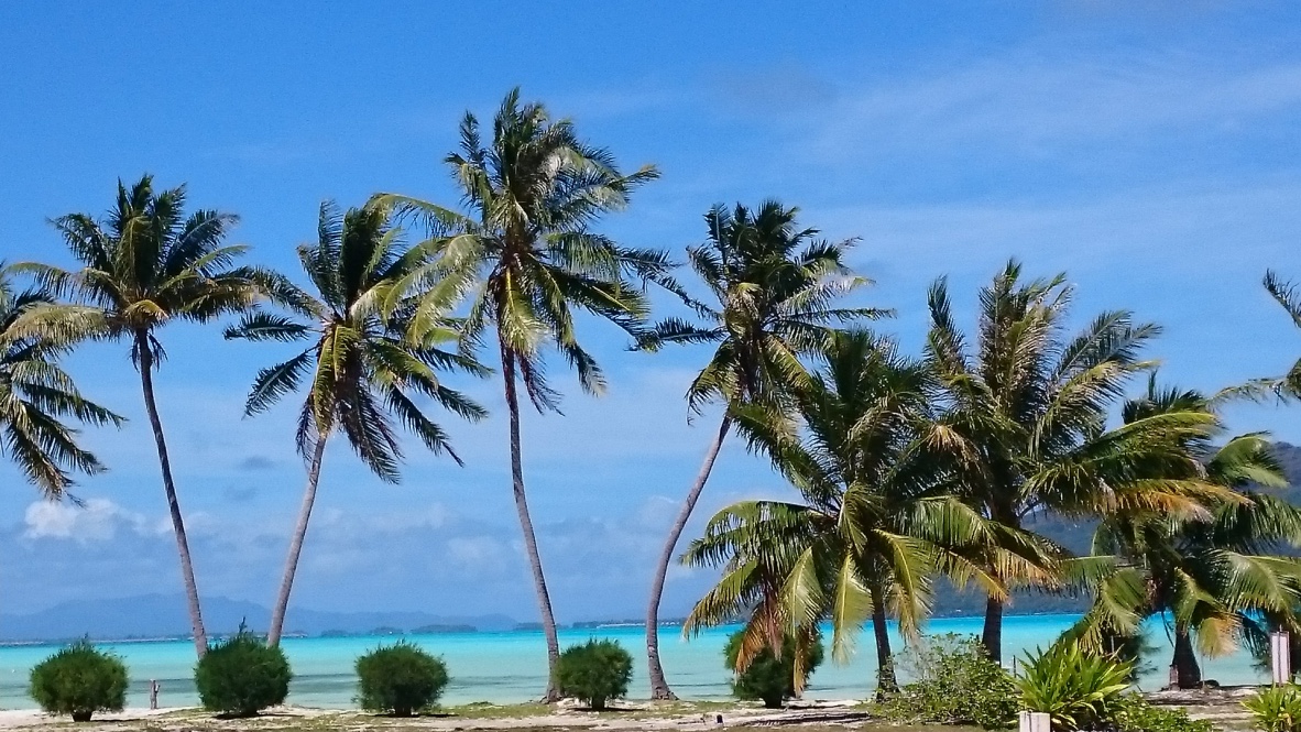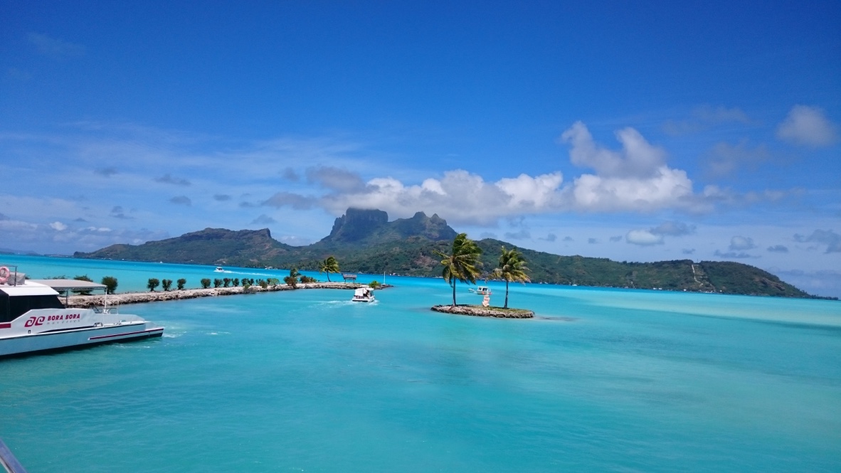 Nach 50 Min. Flugzeit mit der kleinen Propellermaschine (nur 48 Sitzplätze) sicher auf Bora Bora gelandet. Der Flughafen liegt auf einem Motu in der Lagune. Von dort geht es dann mit dem Schnellboot von Air Tahiti quer durch über das knallig türkis-blaue Wasser weiter nach Vaitape, der Hauptstadt der Insel. Unser neuer Host Gérard holt uns mit seinem alten Landrover am Kai ab. Wie die Franzosen halt so sind, gibt es zur Begrüßung zwei Küsschen auf die Wangen. Unser Bungalow ist auf einer kleinen Anhöhe der kleinste auf einer übersichtlichen Anlage mit insgesamt zwei Gebäuden. Das Hauptgebäude hat drei Ferienwohnungen und unterhalb davon befindet sich sein eigener Wohnbereich. Ein weiterer, der blaue Bungalow ist direkt an der Lagune gelegen, mit kleinem Garten und eigener Bootsanlegestelle, dort befinden sich ebenfalls drei Ferienwohnungen. Unser neues Heim ist nur ca. 3 x 2 m groß. Kochnische und Aufenthaltsräumchen sind im Erdgeschoss und die Schlafgelegenheit unter dem Spitzdach. Die Dusche befindet sich im Freien; an einigen Stellen haben die Nachbarn vom Haus gegenüber Einblick in unser Duschprozedere. Am Nachmittag bringt uns Gérard noch zum Matira-Beach, den wohl schönsten Strand, abgesehen von den Stränden auf den Motus, die den Flitterwöchlern und sonstigen Gästen der Overwater-Bungalows in den noblen Resorts vorbehalten sind. Die teuren Hotelketten wie Sofitel, Interkontinental oder Hilton haben sich hier schon die schönsten Eckchen gesichert. Entlang des Strandes sind einige Cafés und Restaurants, wo wir auch noch eine Kleinigkeit zum Essen finden. Da die Hauptsaison im Südhalbkugelsommer von November bis Februar ist, ist der Strand relativ leer. Für uns eine wahre Freude auf mehreren hundert Metern ca. 5 – 10m breitem, feinstem Sand entlang schlendern zu können. Das Wasser der Lagune ist smaragd-grün und ist weit hinein, auch von Kindern, begehbar. Hier und da legt einmal ein Boot aus den Resorts an, um Ausflügler ab- und später wieder aufzuladen. Am Ende des Strandes befindet sich das städtische Badehaus; acht Holzsäulen mit einem strohgedeckten Dach, nach allen Seiten offen, daneben öffentliche Duschen und Toiletten. Dort verweilen vor allem Einheimische im Schatten, die Touristen liegen, wie das „Westler“ für gelegentlich machen, in der prallen Sonne. Danach machen wir noch kurz einen Spaziergang durch Vaitape, was aber aufgrund der geringen Ausdehnung nur ca. eine halbe Stunde dauert. Im Supermarkt nebenan besorgen wir dann noch das nötigste für den Abend: Toilettenpapier, Müsli, Bananen, Milch und zwei Flaschen vom hiesigen Hinano Bier.