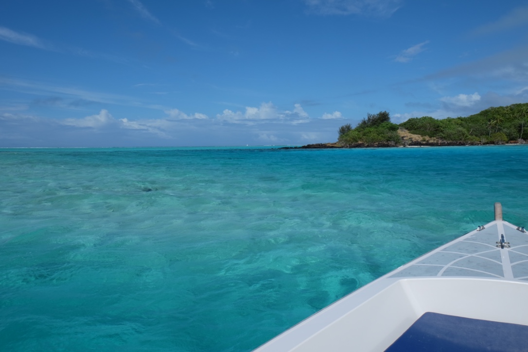 Am Morgen danach stehen wir wieder recht früh auf. Um acht Uhr werden wir am blauen Bungalow zur Lagunenfahrt mit angekündigtem Rochen- und Hai-watching und Korallenschnorcheln abgeholt. Die Fahrt kostet 6000 CPF pro Nase und wird neben Gérard auch von den Autoren von Lonely Planet und Dumont wärmstens empfohlen. Schaumermol!
