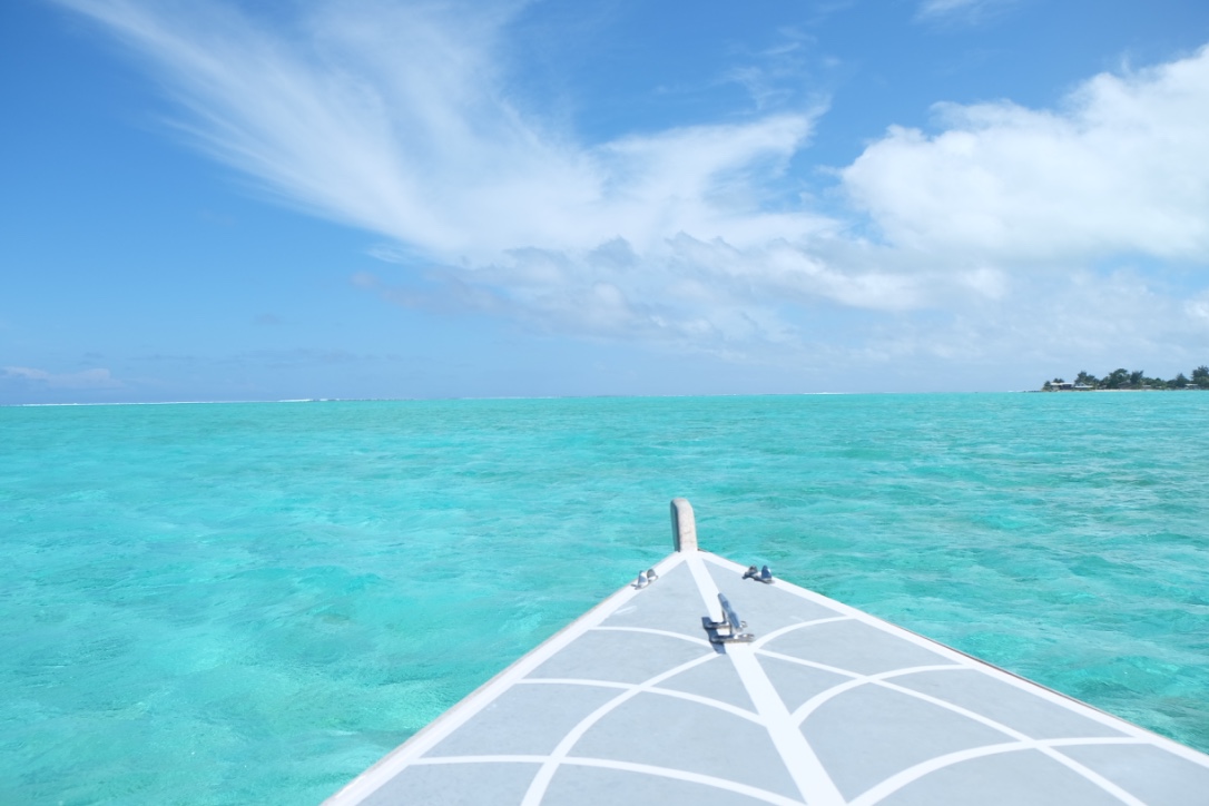 Am nächsten Morgen stehen wir früh auf und packen unsere Rucksäcke. Alex geht noch nach Vaitape, um sich ein paar Perlen zu kaufen. Ich sitze auf der Veranda und schreibe ein bisschen am Bloq. Um 12.00 Uhr holt uns Gérard ab und bringt uns zum Hafen, von dort geht es mit dem Schnellboot wieder zurück zum Flughafen. Aber: Kein Check-In und keine Sicherheitskontrollen. Das Gepäck wird einfach nur in eine Box gebracht und dann in das Flugzeug verfrachtet. Diesmal auf die richtige (nämlich die rechte Seite) gesetzt, damit man aus dem Flugzeug noch ein paar schöne Blicke auf Bora Bora hat.