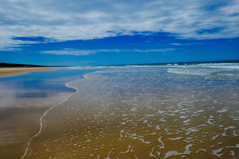 Auf Fraser Island gibt es mit Ausnahme innerhalb des Resorts keine geteerten Straßen. Um zügig voran zukommen wird kurzerhand der Sandstrand – vornehmlich an der Ostküste – als Piste genutzt. Eine tolle Spielwiese für die Männer in ihren aufgemotzten 4-WDs – und gelegentlich auch für Frauen. Die motorisierte Fortbewegung hängt ausschließlich vom Tidenhub ab. Ist gerade Ebbe, dann ist der Strand auf einer Breite von ca. 8m auf festem Untergrund problemlos zu befahren und die Fahrzeuge rasen mit bis zu 80 Km/h aneinander – und an mir – vorbei. Steigt das Meerwasser wieder an, verengt sich die Fahrbahn entsprechend, bzw. sie verlagert sich weiter landeinwärts, wo der weiche Sand das Fahren mitunter recht schwierig macht. Dort, wo Meerwasser auf den Strand kommt, ist es ausdrücklich verboten zu fahren. In der Hauptsaison sind 1000 Fahrzeuge auf der Insel, aber auch jetzt ist teilweise mächtig viel los auf der Sandautobahn.