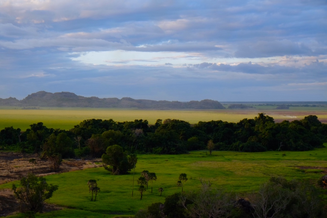 Ich fahre weiter Richtung Nordosten, nach Ubirr Rock. Dort besichtige bekomme ich die ersten Felsmalereien zu Gesicht. Am späten Nachmittag klettere ich auf das vorgelagerte Felsplateau und genieße von dort im Abendlicht eine atemberaubende Aussicht auf die Nardab Flood Plain. Das Gelände ist von Rauchschwaden überzogen, das Abendlicht taucht die Landschaft in sanften Nebel. Überall in Australien werden von den Rangern aus Europa und Asien eingebrachte aggressiven Gräberarten abgebrannt, um die endemischen Arten zu erhalten.