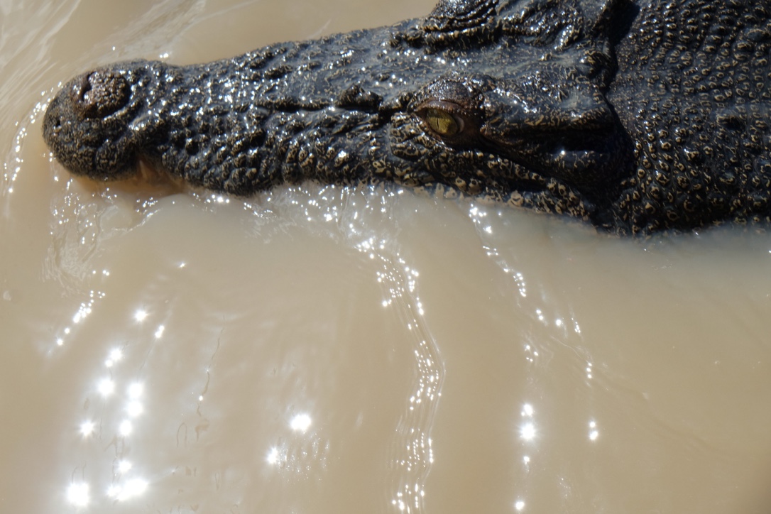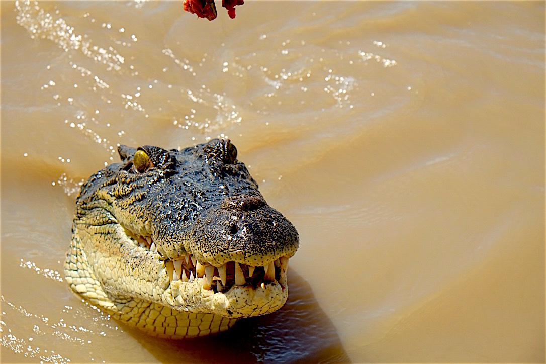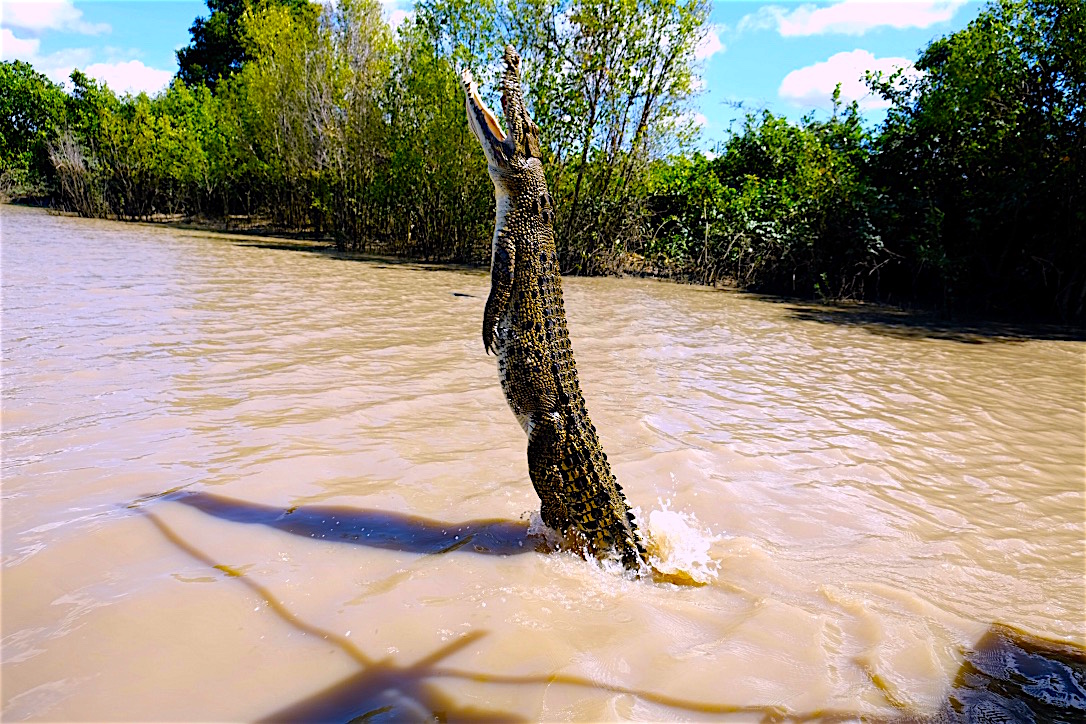 Ich fahre weiter Richtung Westen bis zum East Alligator River. Dort will ich mir auf einer Bootstour die hier in freier Wildbahn lebenden Leistenkrokodile (Crocodylus porosus, auch Salzwasserkrokodil genannt), ansehen. Das Saltie ist das größte heute noch lebende Krokodil. Entsprechend groß ist mein Respekt vor diesem einstündigen Ausflug mit dem kleinen Holzboot hinaus auf den trüben Fluss. „Bis jetzt ist noch jeder wieder zurückgekommen“ ist die saloppe Antwort auf meine Frage, ob das denn irgendwie gefährlich sei. Die Leute stehen Schlange. Die ersten 30 Leute drängen sich auf den Holzbänken des Bötchens, das an den beiden Seiten mit einem 50 Zentimeter hohen Stahlgitter geschützt ist. Ich habe Glück. Die Veranstalter setzen ein Zusatzboot ein. Wir sind nur zu acht. Mit einem mulmigen Gefühl wanke ich über den schmalen Steg hinüber auf das Boot. Die einstündige Tour zu den „Jumping Crocodiles“ führt im Zick-Zack-Kurs ca. 2000m den Fluss hinauf. Fünf mal stoppen wir, um die Tiere aus der Nähe zu betrachten. Die längsten sind über vier Meter lang, auch zwei Baby-Krokodile bekommen wir zu sehen. Die Krokodile werden vom Bootsführer mit Fleischhappen angelockt und springen bis zu zwei Meter aus dem Wasser, um ihr verdientes Mittagessen zu ergattern und unter Wasser zu verschlingen. Ein in die Jahre gekommenes Exemplar kommt beim Aufbäumen ins Schwanken und knallt an das Stahlgitter des Bootes. Wir weichen apathisch geschlossen einen Meter zurück. „Don`t worry“, sagt der Bootsführer. Die Tiere seien relativ steif und daher ist es unmöglich für sie über das Metallgitter in das Innere des Bootes zu gelangen. Nur die Hände und der restliche Körper sollten sich nicht über der Reling befinden…..