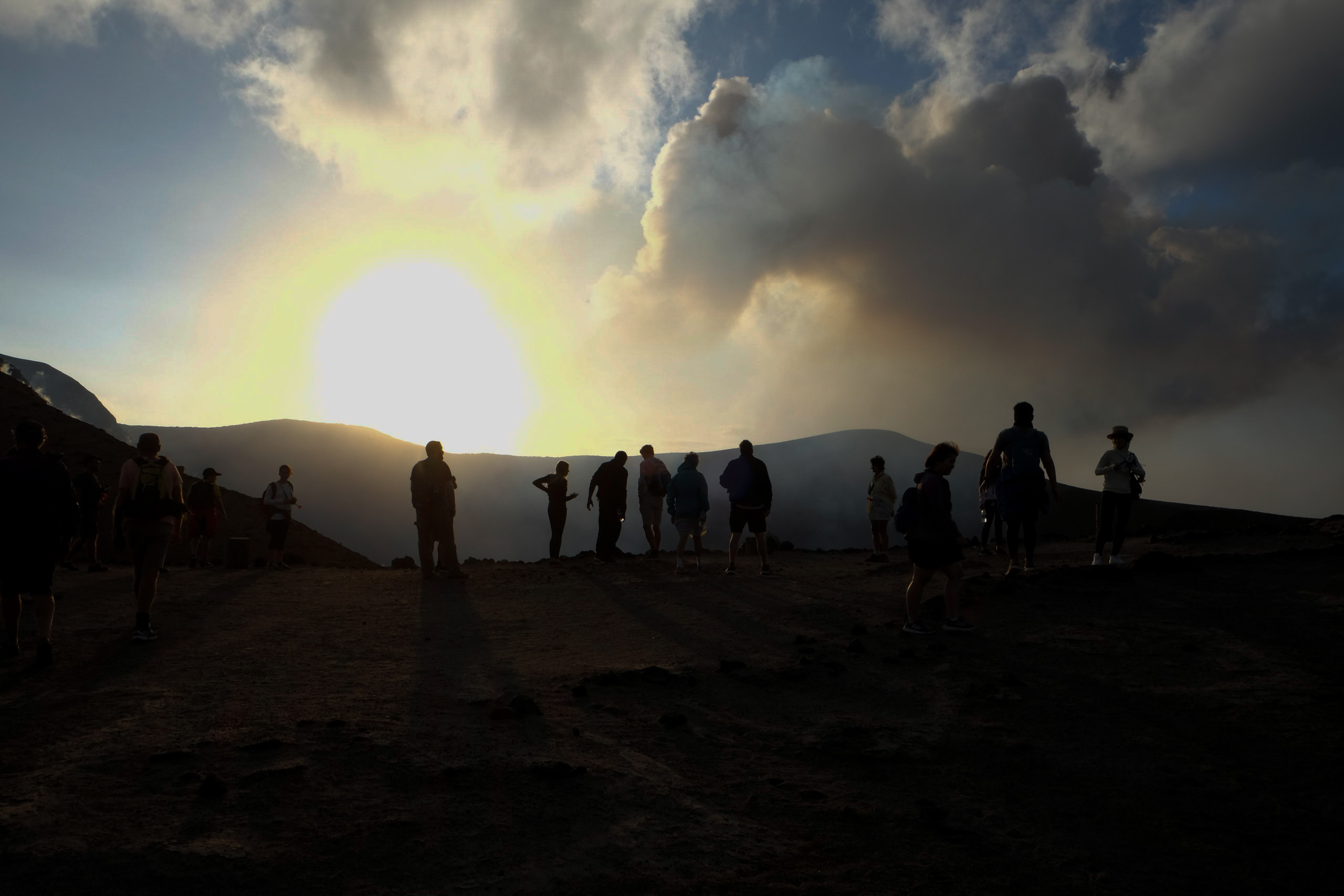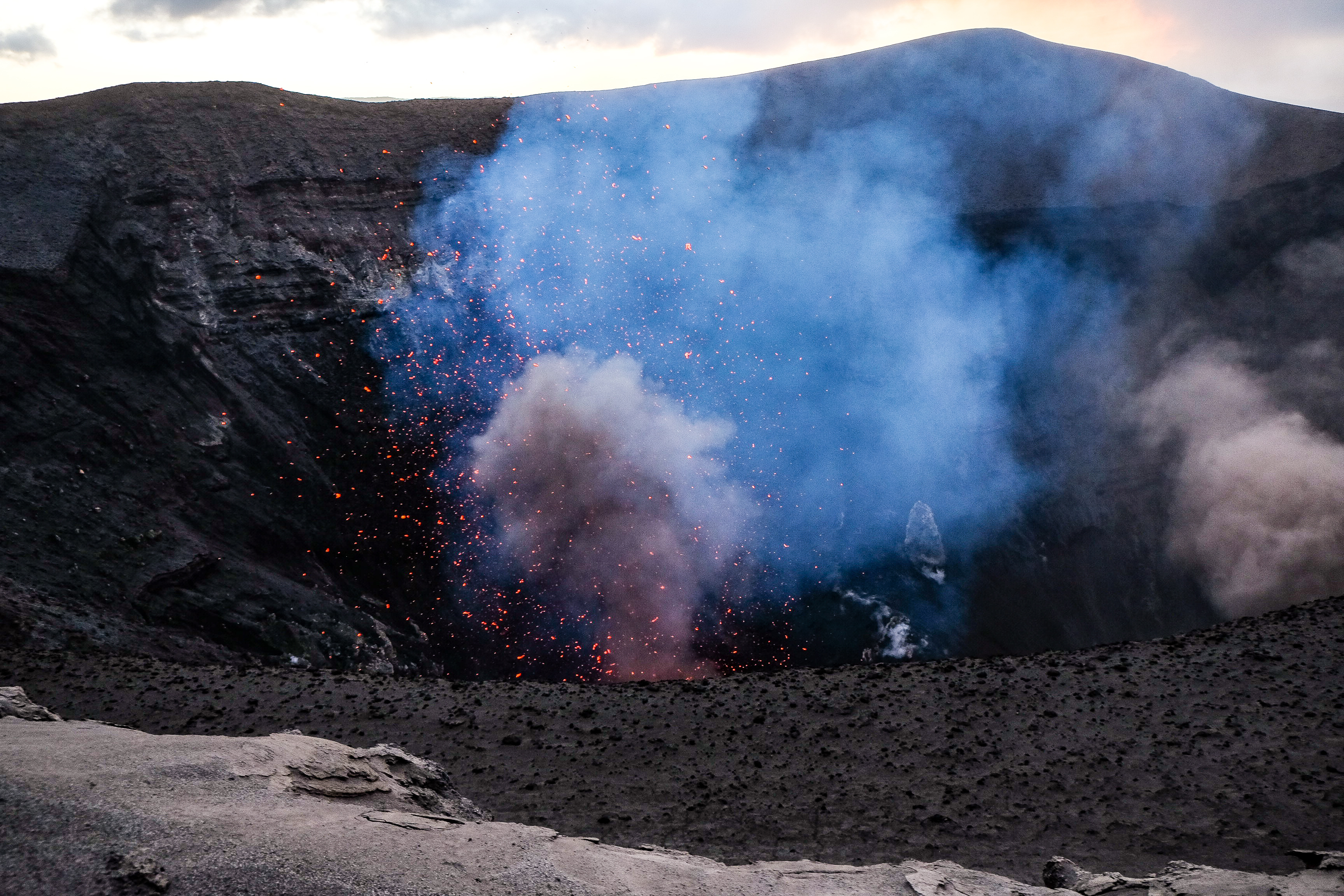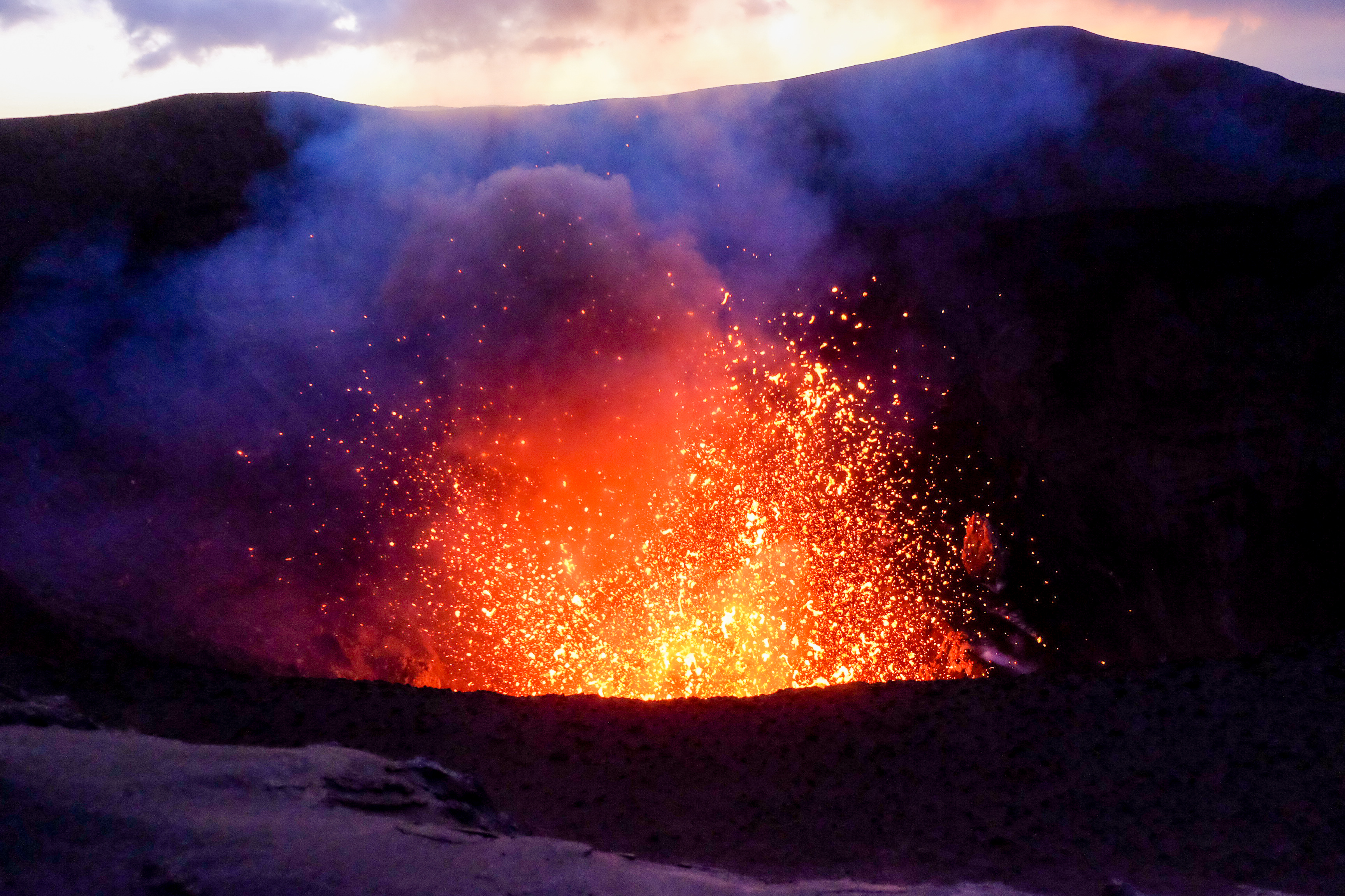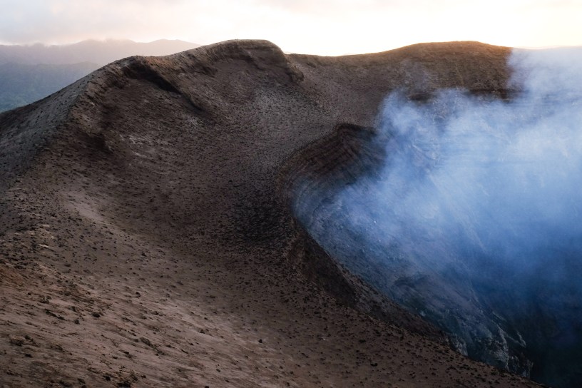 Der eigentliche Grund für meinen Besuch auf Tanna ist der aktive Vulkan Yasur im Süden der Insel. Geografisch gesehen gehören die Vulkane Vanuatus zum pazifischen Feuergürtel. Der am häufigsten vorkommende Typus ist der Stratovulkan (Schichtvulkan), der aus abwechselnden Schichten von Lava und Lockerenmaterialien (vor allem Asche) aufgebaut ist. Er ist leicht an seiner relativ steilen und spitzkegeligen Form zu erkennen. Während viele Vulkane Vanuatus nur sporadisch aktiv sind, ist der Yasur seit mindestens 800 Jahren mit bis zu 500 Explosionen pro Tag daueraktiv und macht somit seinem Beinamen „Leuchtfeuer des Pazifiks“ alle Ehre. Sein Krater hat einen Durchmesser von mehr als 300 Metern und mehrere Förderschlote, von denen zur Zeit drei aktiv sind.